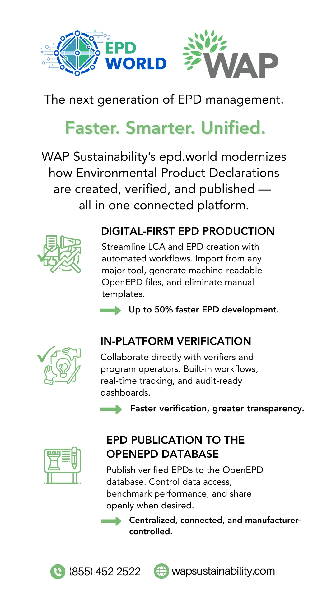 Driven by data and guided by practical experience, WAP provides the leadership and tools to make sustainability measurable, actionable, and credible. From assessment through publication, we help streamline certification efforts, meet customer expectations, and build long-term value through transparency and performance.